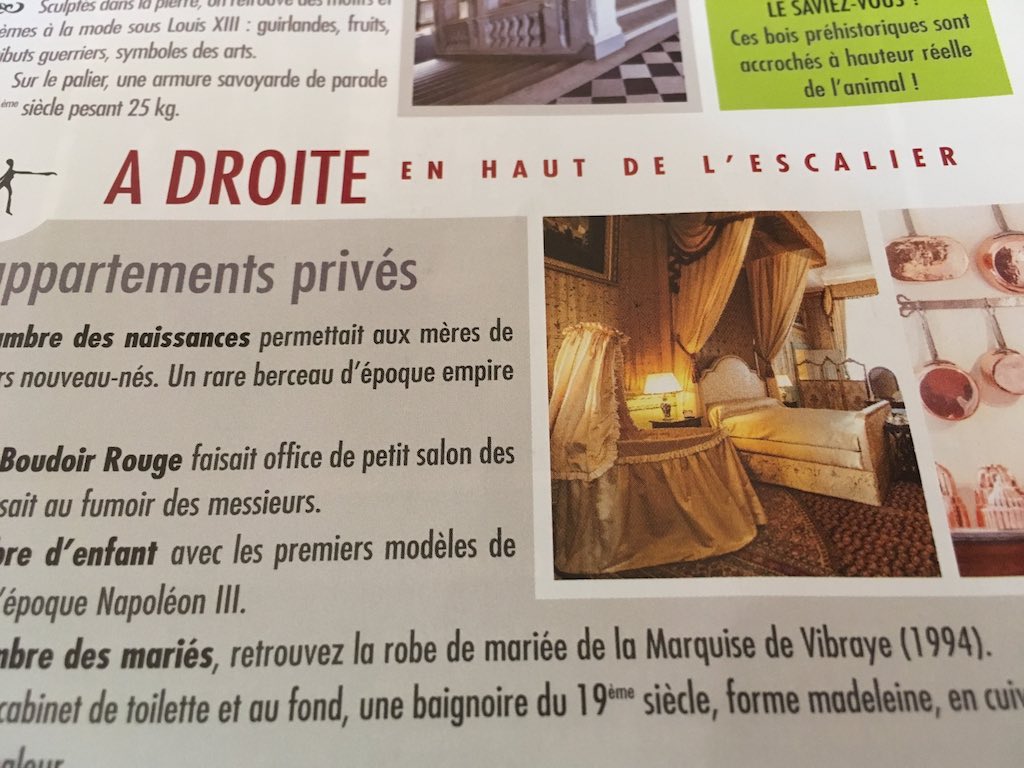 パンフレットの最初のページの上段にはこの城の歴史や概略が書いてあります。そして下部には「入って右手(A DROITE EN ENTRANT)」と書いてあります。そこには食堂(La Salle à manger)があります。