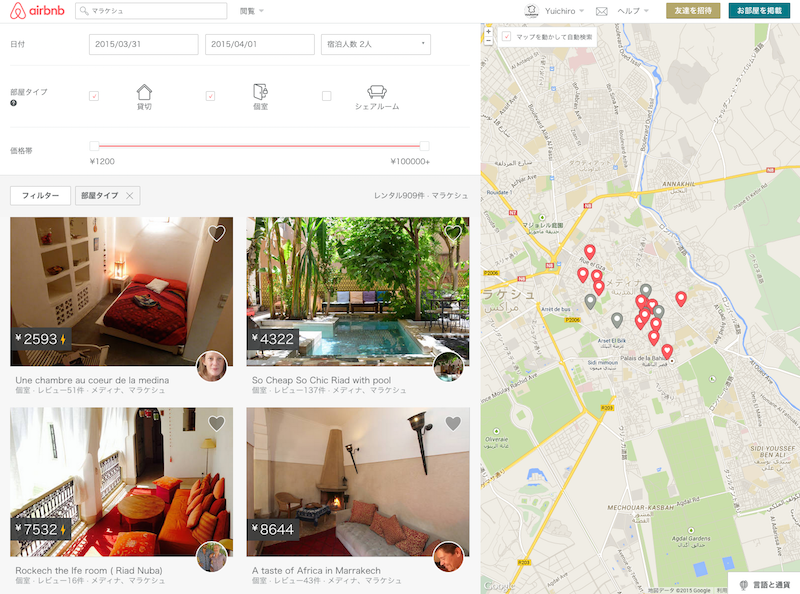 そこでAirbnb。マラケシュ、フェズといった街では非常に多くのリスティング=Airbnbに登録している部屋がたくさんあり、しかもそのほとんどがガイドブックやBooking.comで紹介・検索されたホテル・リヤドと比較して何割も安いんです。半額以下かと普通ですし。すごいな。