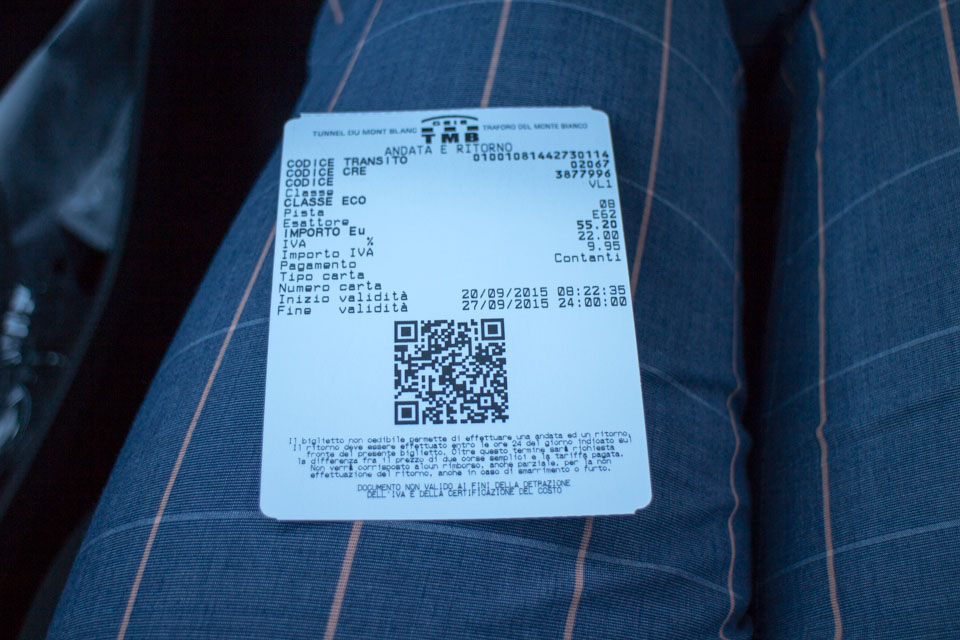 がしかし、この通過が高くついた(涙)。まずこのトンネルの通行料ですが、往復で55.2ユーロにVATが22%加わり合計65.15ユーロ。かなり高い!!ちなみにこの往復券は7日間有効だとか。しかし、僕の場合はせいぜい2時間といったところ。