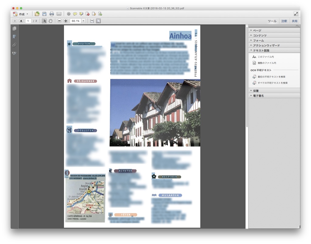僕は[highlight]Adobe AcrobatのOCR機能を利用[/highlight]してみました。(他に無いからです。CS6時代の名残で使えます。)青いハイライトの部分がテキスト読み取りができた箇所。ほぼ網羅しているのではないでしょうか。