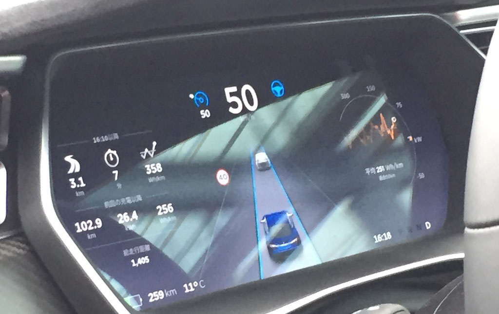 この自動ブレーキは、前の車に追随している場合にかかるようですが、ブレーキがかかり始めるタイミングがまだわからない、またテスラのブレーキングの具合というかクセがどの程度なのかまだ把握していない、といった理由から、どうしても早めにブレーキをかけてしまう。すると自動運転機能が解除されるのです。