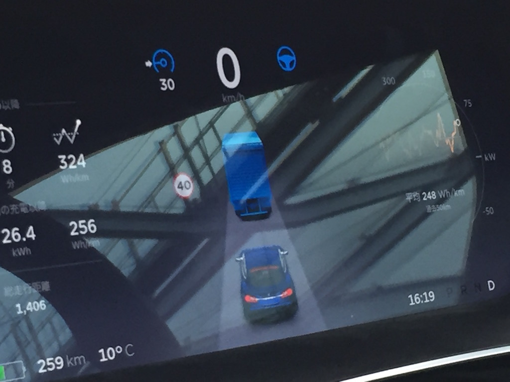 これらの自動運転機能は、前後に6つずつ、合計12個の超音波センサー、前方に車間距離などを計測するレーダー、フロントガラス上部に配置されたカメラ、合計3つで実現しているとのことです。昨年試乗した時にすでにハードウェア上では自動運転機能を行う上での準備はできているというのは、このことを指していたのでしょう。