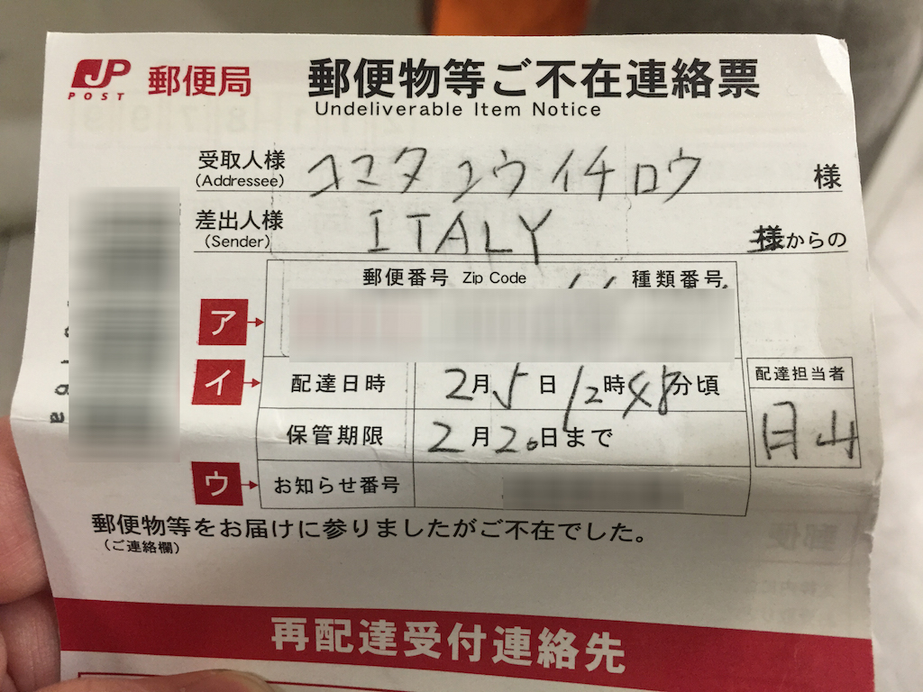 先日、ポストを見ると「ITALY様」からお手紙が届いているとの不在通知票がありました。