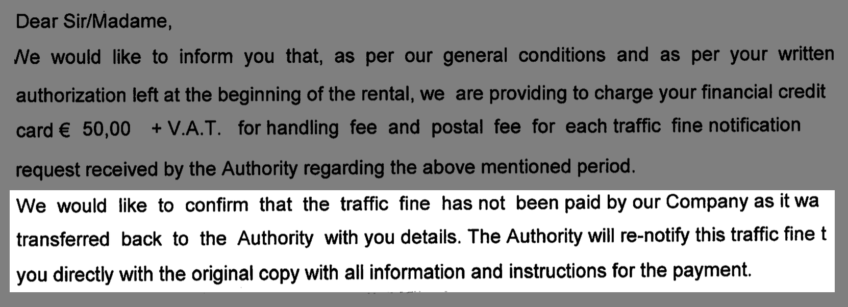 「書類を日本の僕の住所に届けてくれるように警察に連絡した。あと、来た書類を送り返した。だから、その手数料50ユーロと書類返却にかかった郵送代をおまえのクレジットカードから引いとくわ。よろしく。あと、警察から多分そのうち連絡くるから、そのときはしっかり指示に従って反則金払っとけよ。」